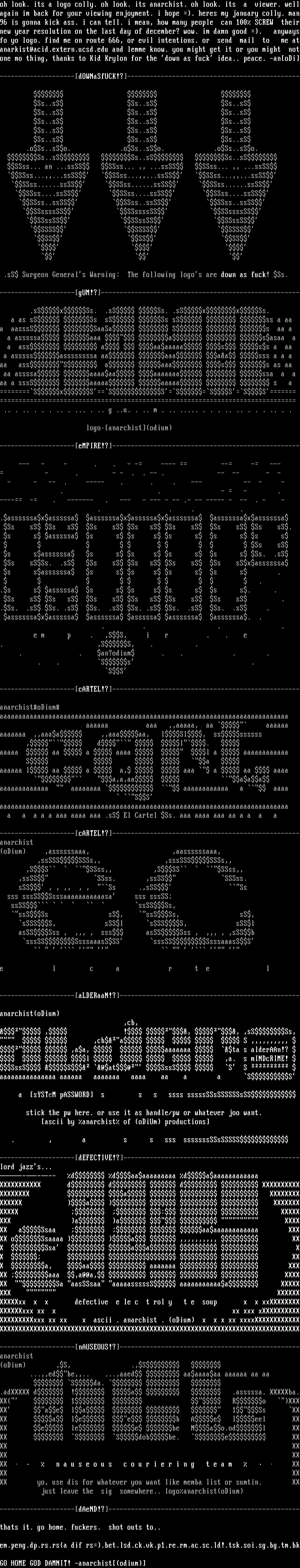 oh look. its a logo colly. oh look. its anarchist. oh look. its a viewer. wellagain im back for your viewing enjoyment. i hope . heres my january colly. man96 is gonna kick ass. i can tell. i mean, how many people can 100 SCREW theirnew year resolution on the last day of december? wow. im damn good . anywaysfo yo logo. find me on route 666, or evil intentions. or send mail to me atanarkist@acid.extern.ucsd.edu and lemme know. you might get it or you might notone mo thing, thanks to Kid Krylon for the down as fuck idea.. peace. -anoDi