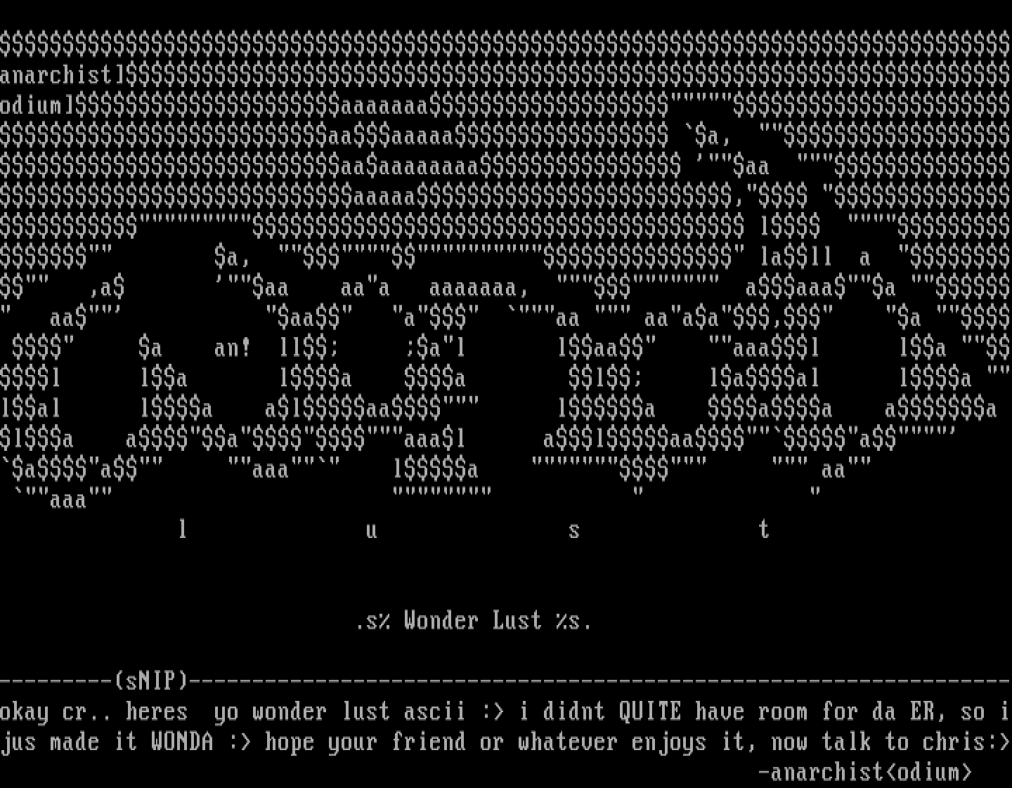 ---------sNIP-----------------------------------------------------------------okay cr.. heres yo wonder lust ascii : i didnt QUITE have room for da ER, so ijus made it WONDA : hope your friend or whatever enjoys it, now talk to chris: -anarchistodium