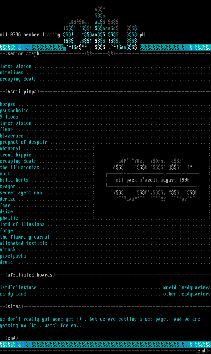 korpse .........................................................................psychoholic ....................................................................9 lives ........................................................................inner vision ...................................................................fluor ..........................................................................blazemore ......................................................................prophet of despair .............................................................abnormal ..........................: :trend hippie ......................: :creaping death ....................: ,a@PY@s, Y@m, dP :the illusionist ...................: d b j f! :mort ..............................: ---.- :killa hertz .......................: : oil packoascii august 1996 :crayon ............................: --- .-- :secret agent man ..................: Y P,, Y b :demize ............................: aaa YP as :fear ..............................: :daize .............................: :phallic ...........................:...........................................:lord of illusions ..............................................................forge ..........................................................................the flamming carrot ............................................................alienated testicle .............................................................adrock .........................................................................pixelpusha .....................................................................druid ..........................................................................