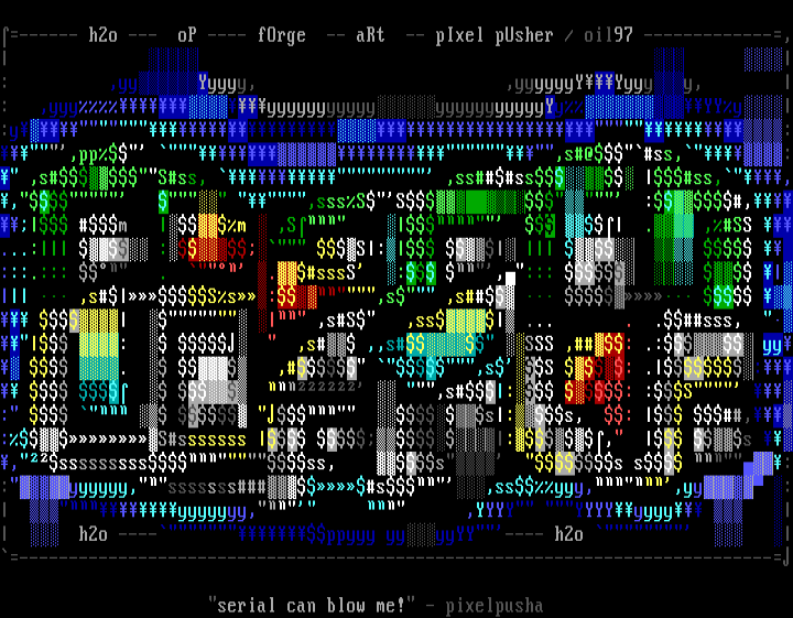 ------ h2o --- oP ---- fOrge -- aRt -- pIxel pUsher / oil97 -------------, : ,yyYyyyy, ,yyyyyyYYyyyy, : ,yyyyyyyyyyyyyyyyyyyyyyyyyYyYYy:y:,pp ,s@ss,: ,sSss, ,ssss ss,,, ,sssSS :,