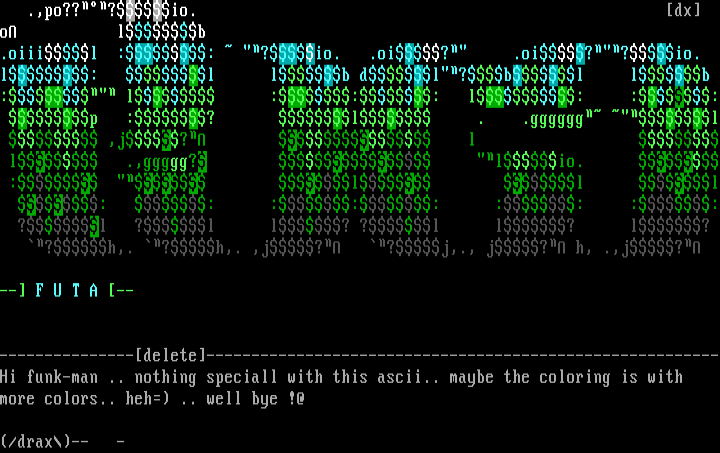 ---------------delete---------------------------------------------------------Hi funk-man .. nothing speciall with this ascii.. maybe the coloring is with