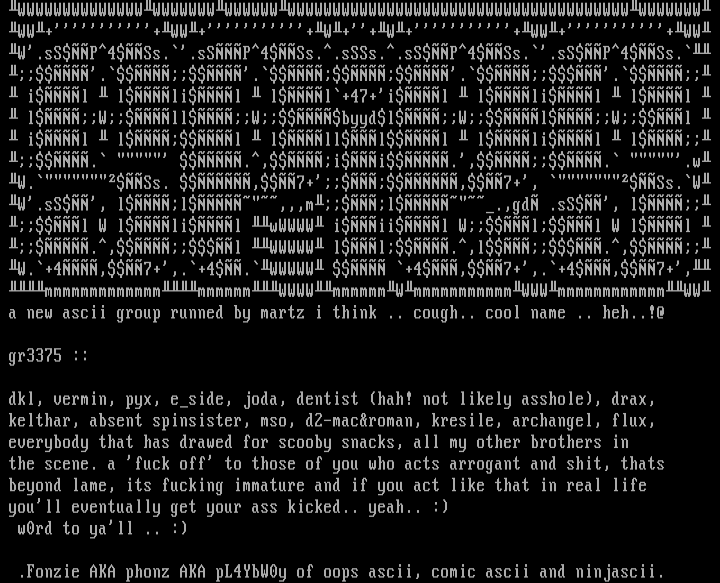 .Fonzie AKA phonz AKA pL4YbW0y of oops ascii, comic ascii and ninjascii.