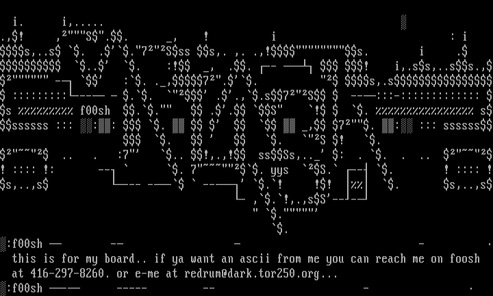 :f00sh - - this is for my board.. if ya want an ascii from me you can reach me on foosh