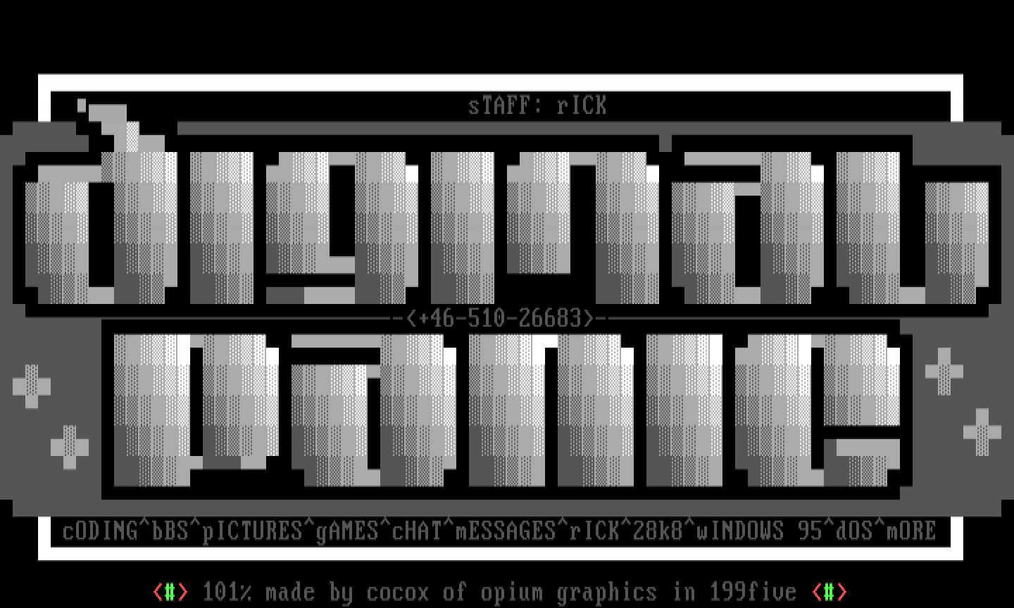 cODINGbBSpICTURESgAMEScHATmESSAGESrICK28k8wINDOWS 95dOSmORE 101 made by cocox of opium graphics in 199five