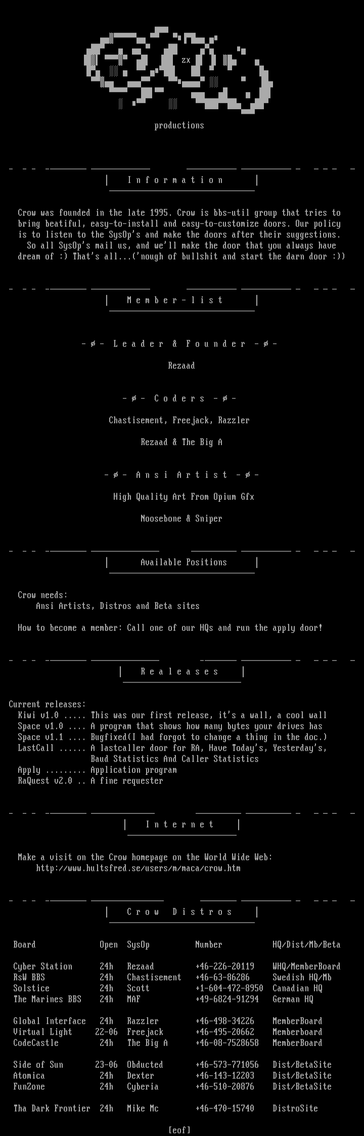 Crow was founded in the late 1995. Crow is bbs-util group that tries to