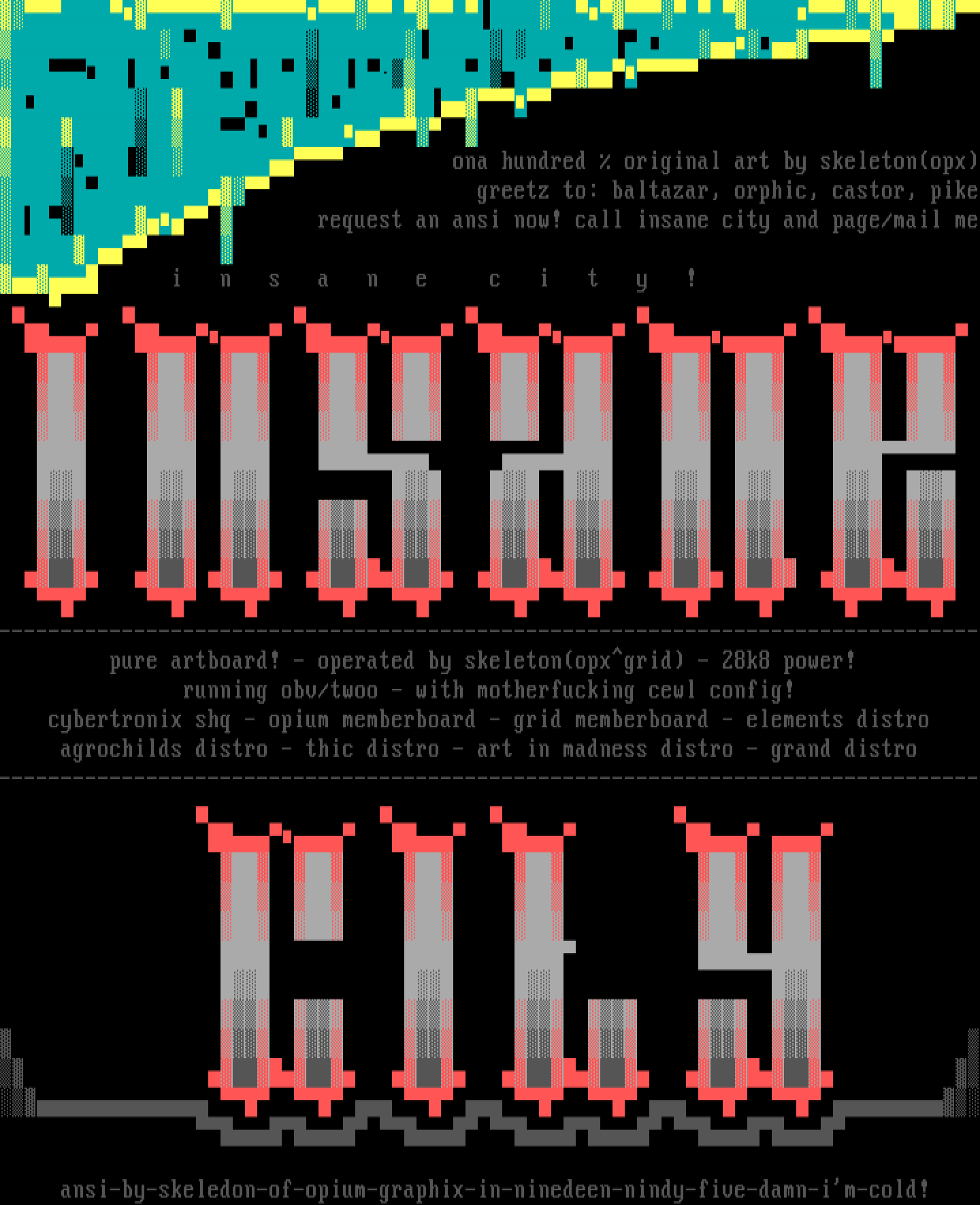 ona hundred original art by skeletonopx greetz to: baltazar, orphic, castor, pike request an ansi now! call insane city and page/mail me