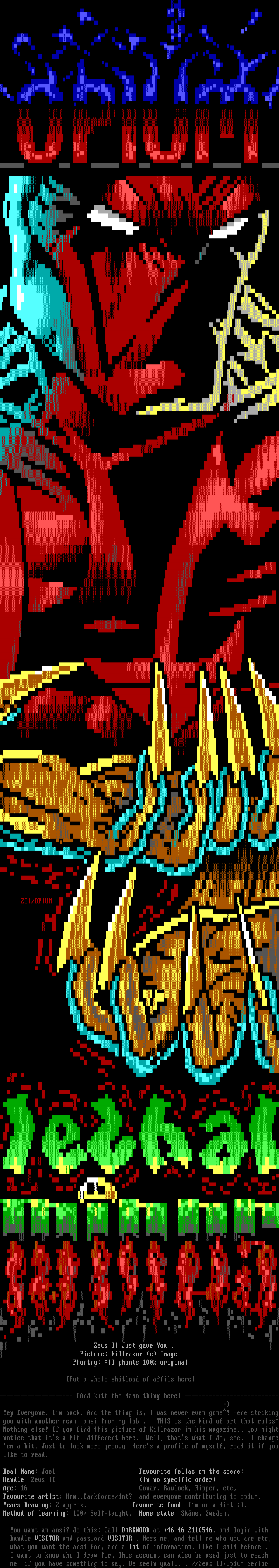 Yep Everyone. Im back. And the thing is, I was never even gone! Here striking you with another mean ansi from my lab... THIS is the kind of art that rules! Nothing else! If you find this picture of Killrazor in his magazine.. you might notice that its a bit different here. Well, thats what I do, see. I change em a bit. Just to look more groovy. Heres a profile of myself, read it if you like to read.