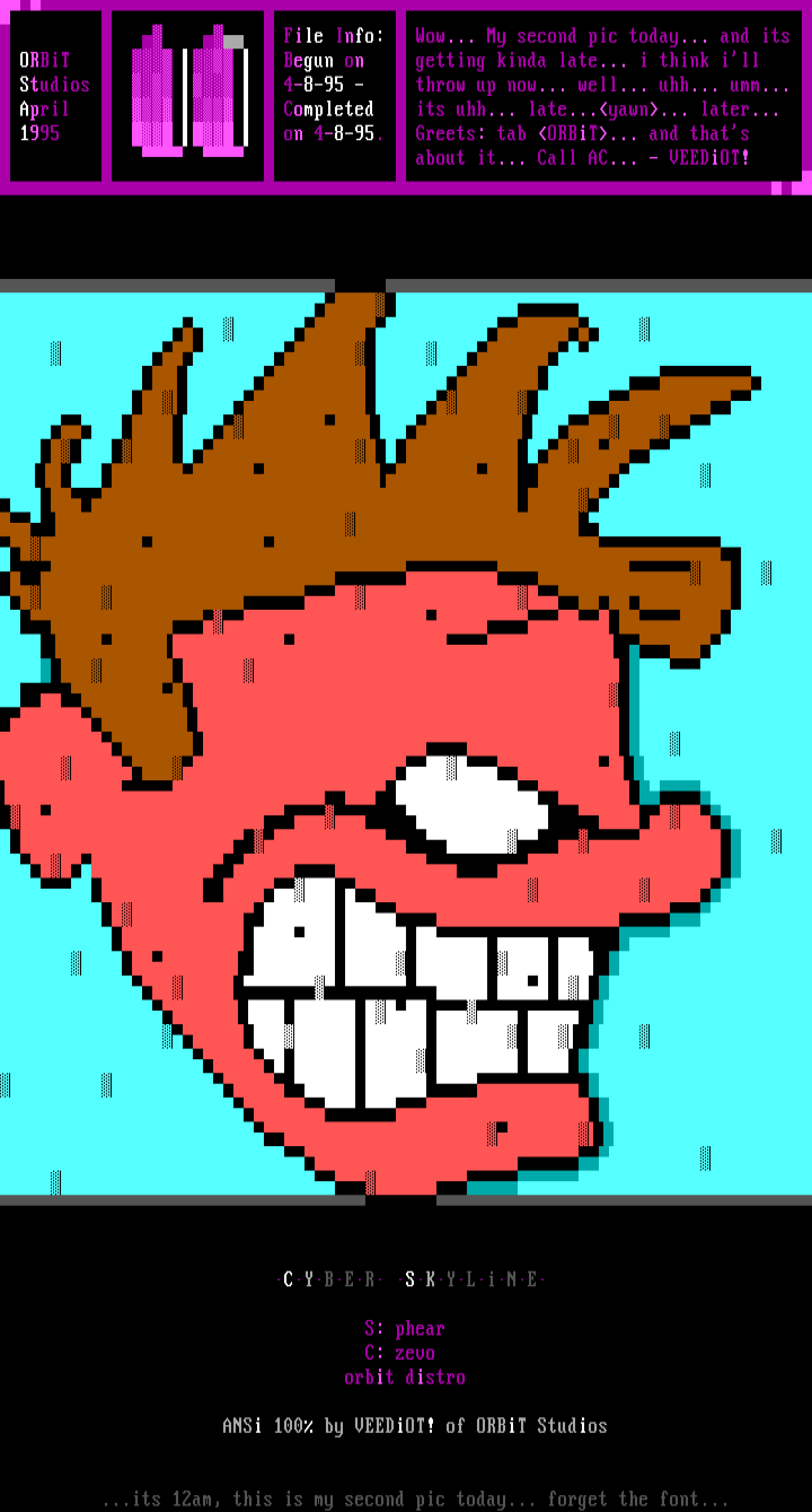 File Info: Wow... My second pic today... and its ORBiT Begun on getting kinda late... i think ill Studios 4-8-95 - throw up now... well... uhh... umm... April Completed its uhh... late...yawn... later... 1995 on 4-8-95. Greets: tab ORBiT... and thats about it... Call AC... - VEEDiOT!