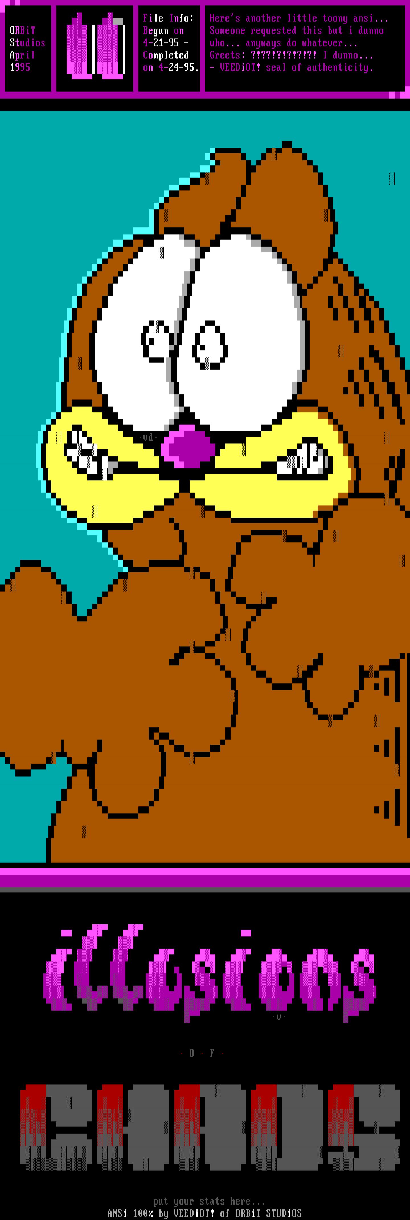 File Info: Heres another little toony ansi... ORBiT Begun on Someone requested this but i dunno Studios 4-21-95 - who... anyways do whatever... April Completed Greets: ?!??!?!?!?!?! I dunno... 1995 on 4-24-95. - VEEDiOT! seal of authenticity.
