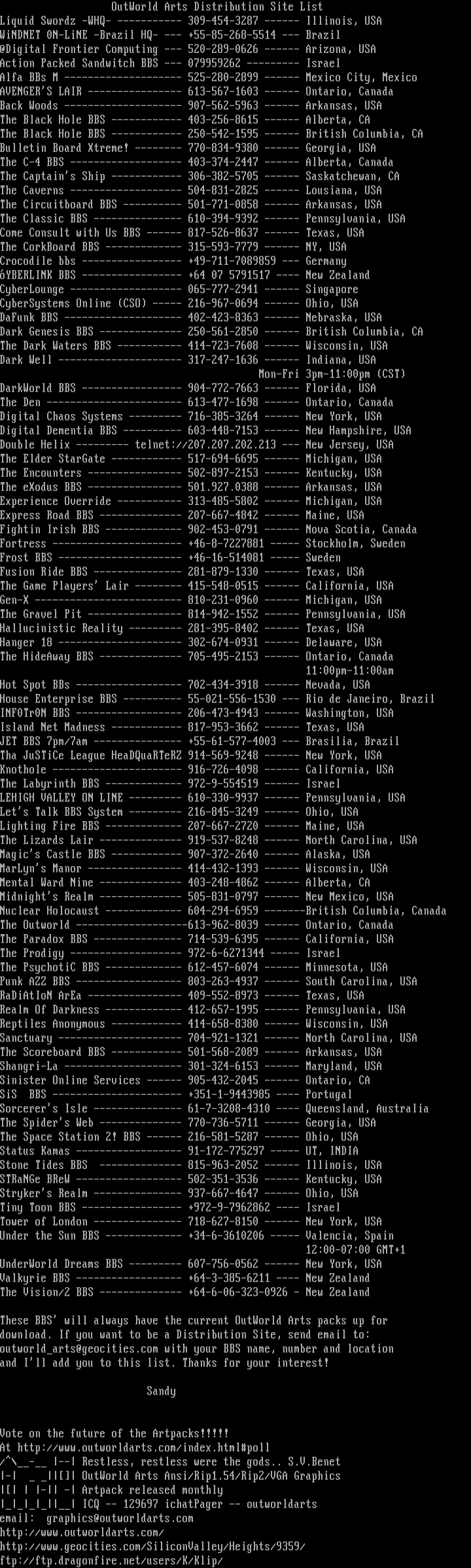 outworldarts@geocities.com with your BBS name, number and location