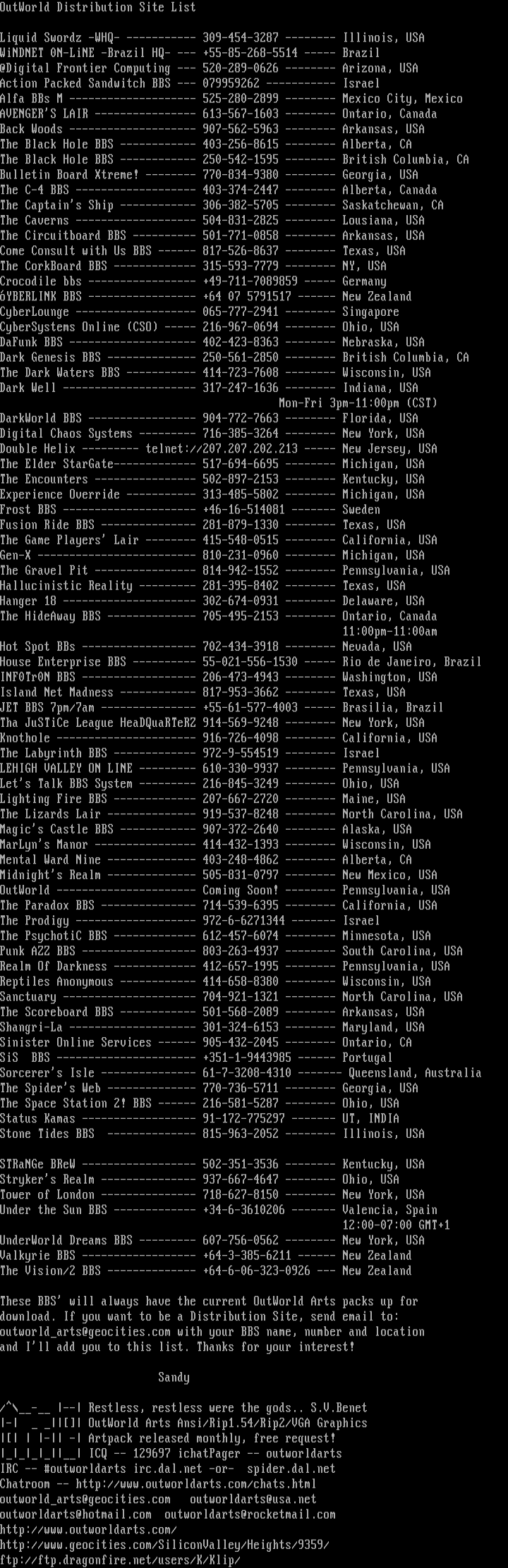 - OutWorld Arts Ansi/Rip1.54/Rip2/VGA Graphics