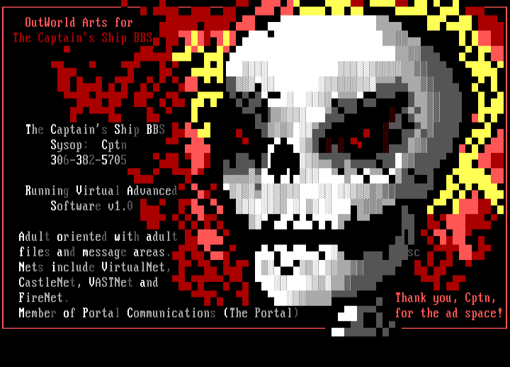 OutWorld Arts for The Captains Ship BBS The Captains Ship BBS Sysop: Cptn 306-382-5705 Running Virtual Advanced Software v1.0 Adult oriented with adult files and message areas. sc Nets include VirtualNet, CastleNet, VASTNet and FireNet. Thank you, Cptn, Member of Portal Communications The Portal for the ad space!