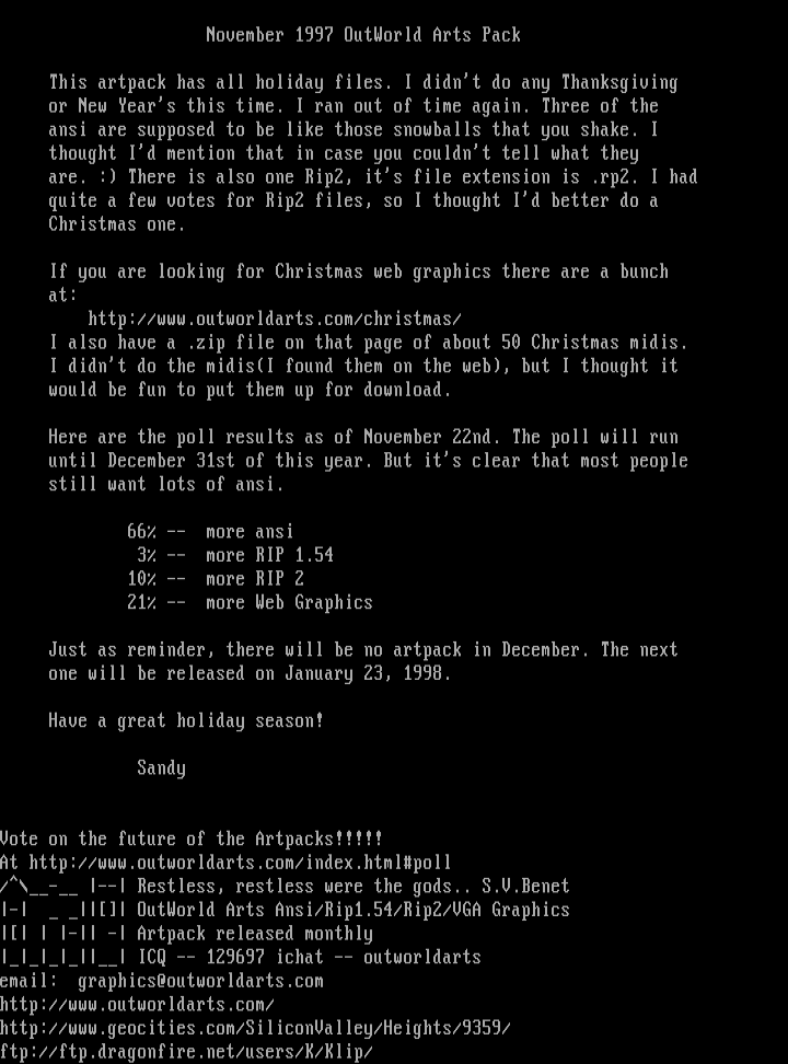 - OutWorld Arts Ansi/Rip1.54/Rip2/VGA Graphics