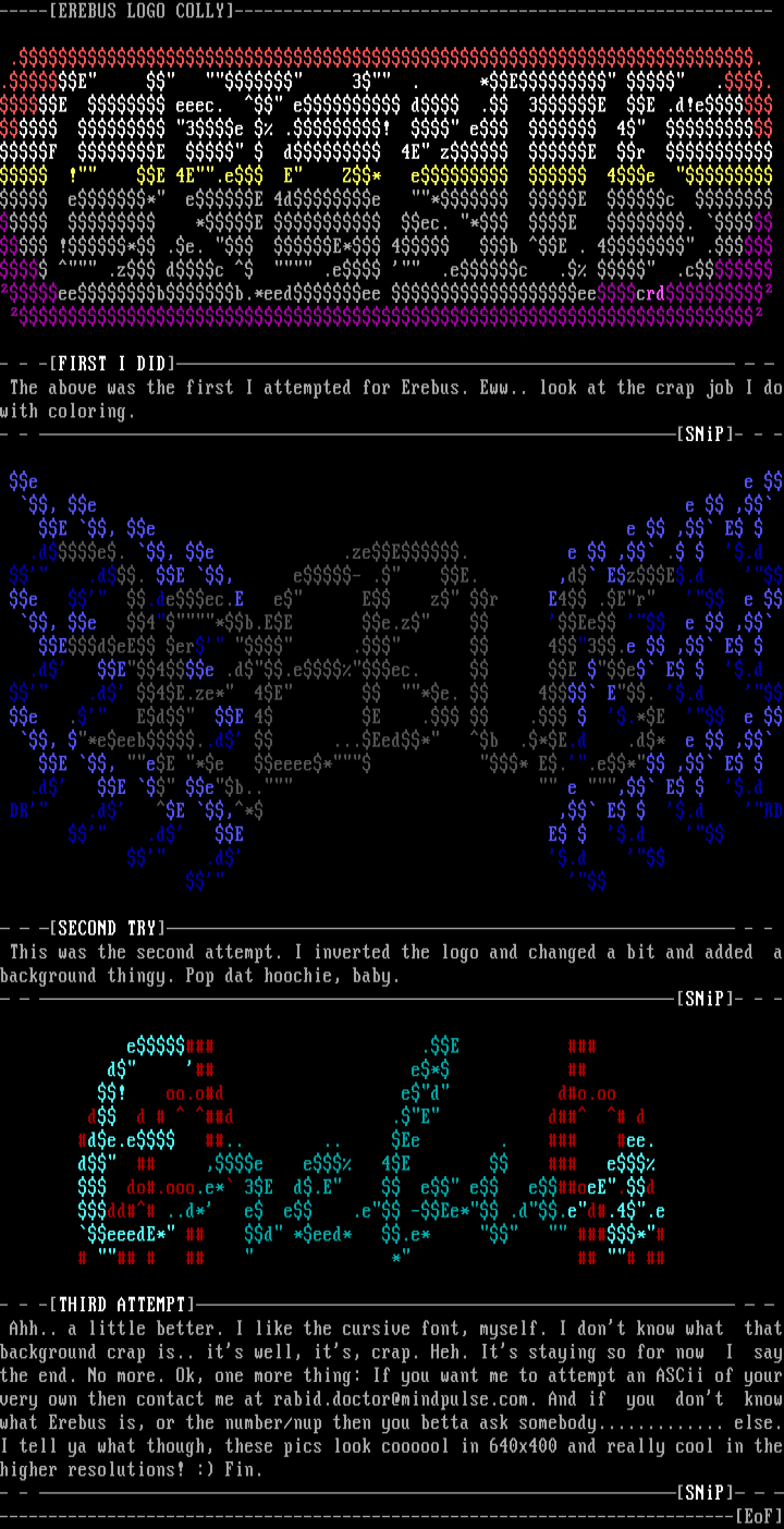 - - -THIRD ATTEMPT Ahh.. a little better. I like the cursive font, myself. I dont know what thatbackground crap is.. its well, its, crap. Heh. Its staying so for now I saythe end. No more. Ok, one more thing: If you want me to attempt an ASCii of yourvery own then contact me at rabid.doctor@mindpulse.com. And if you dont knowwhat Erebus is, or the number/nup then you betta ask somebody............. else.I tell ya what though, these pics look coooool in 640x400 and really cool in thehigher resolutions! : Fin.