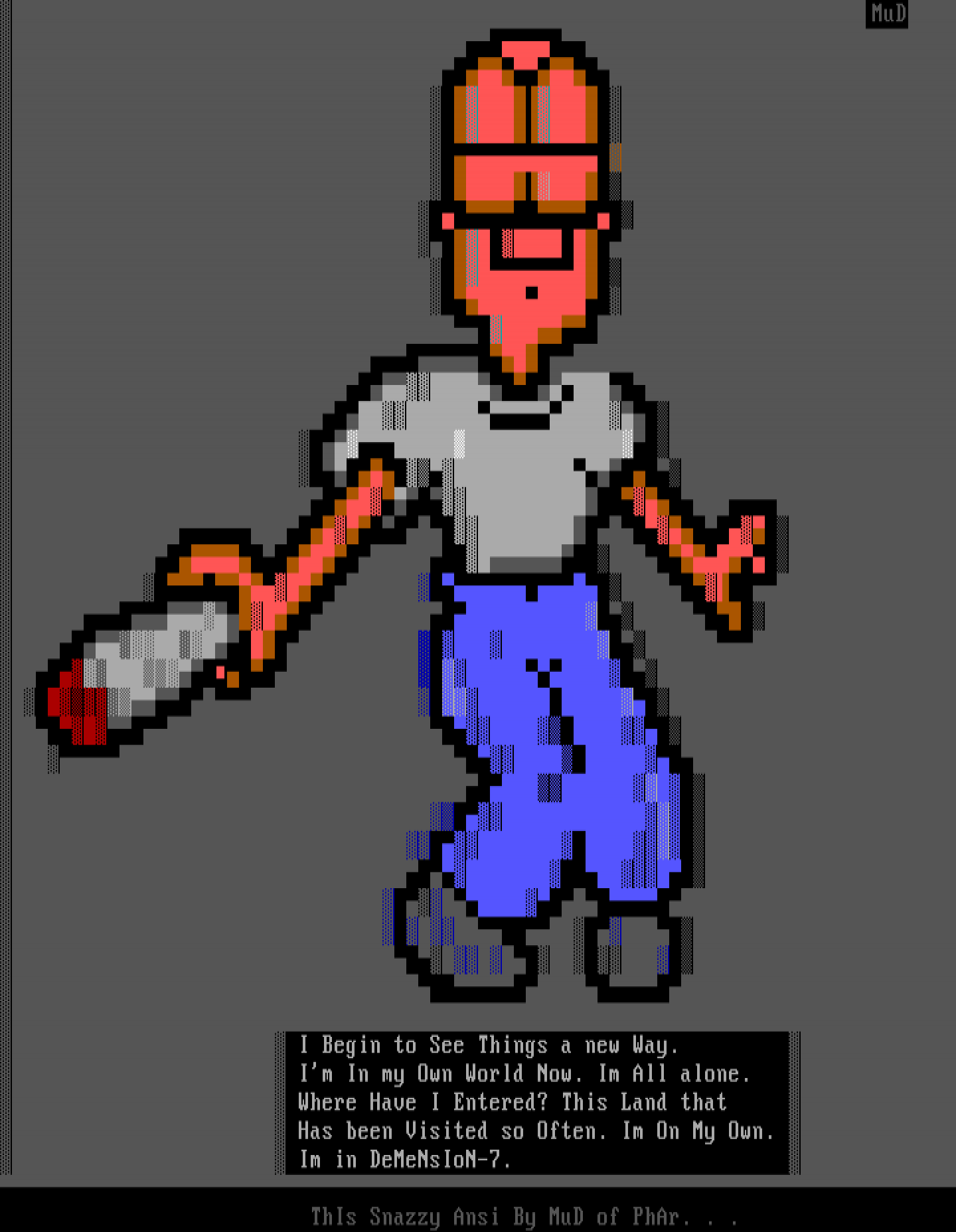 MuD I Begin to See Things a new Way. Im In my Own World Now. Im All alone. Where Have I Entered? This Land that Has been Visited so Often. Im On My Own. Im in DeMeNsIoN-7. ThIs Snazzy Ansi By MuD of PhAr. . .