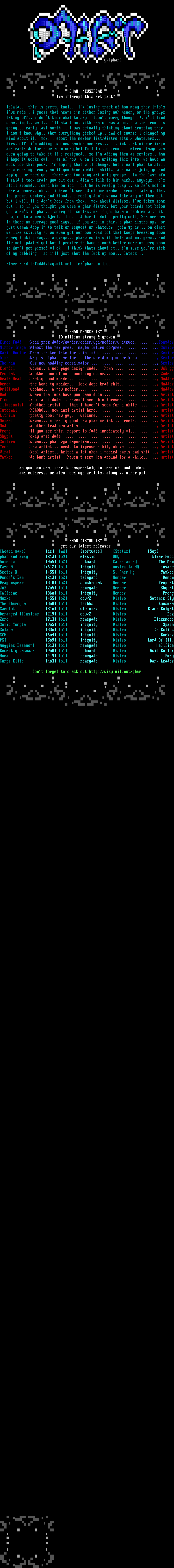 Death Head pretty good modder........................................, ModderDemon the bomb tg modder... 1oo dope krad shit................., ModderDriftwood woohoo... a new modder...................................., ModderBad where the fuck have you been dude........................., ArtistFlood kool ansi dude... havent seen him forever................, ArtistIllusionist Another artist... that i havent seen for a while........., ArtistInternal h0h0h0... new ansi artist here............................, ArtistLithium pretty cool new guy... welcome............................, ArtistMenzel w0wee... a really good new phar artist... greetz.........., ArtistMud another krad new artist..................................., ArtistProng if you see this, report to fudd immediately ............, ArtistShypht okay ansi dude............................................, ArtistSunfire wowee... phar vga department.............................., ArtistTech new artist... needs to improve a bit, oh well............., ArtistViral kool artist.. helped a lot when i needed ansis and shit..., ArtistYankee da bomb artist.. havent seen him around for a while......, Artist