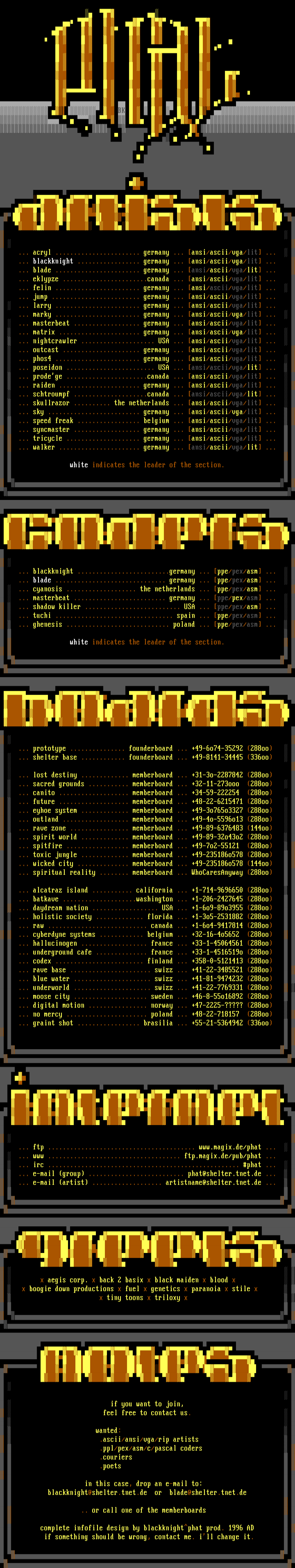 ... ftp ........................................ www.magix.de/phat ... ... www .................................... ftp.magix.de/pub/phat ... ... irc .................................................... phat ... ... e-mail group .......................... phat@shelter.tnet.de ... ... e-mail artist ................... artistname@shelter.tnet.de ...