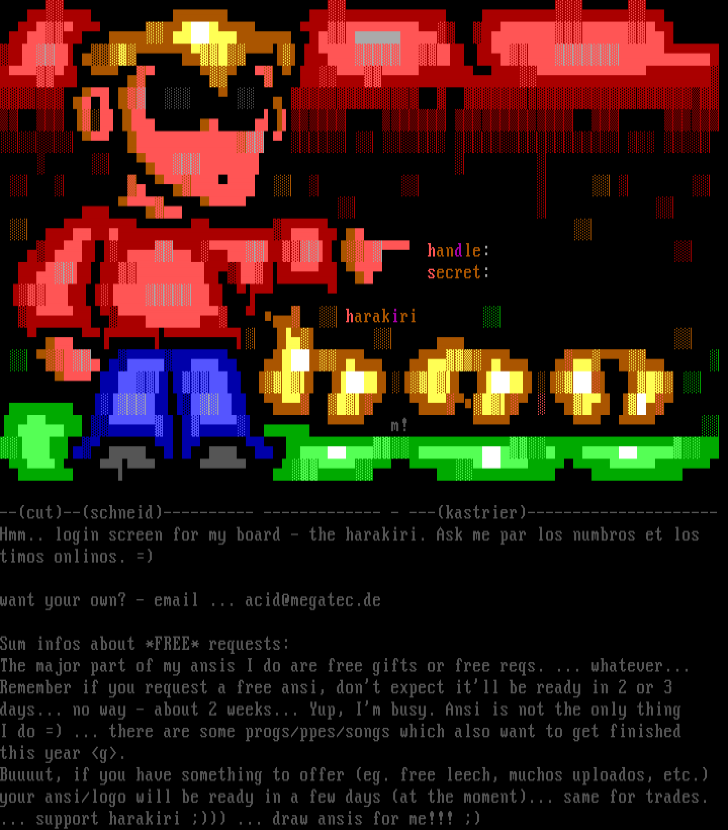 --cut--schneid---------- ------------- - ---kastrier--------------------- Hmm.. login screen for my board - the harakiri. Ask me par los numbros et los