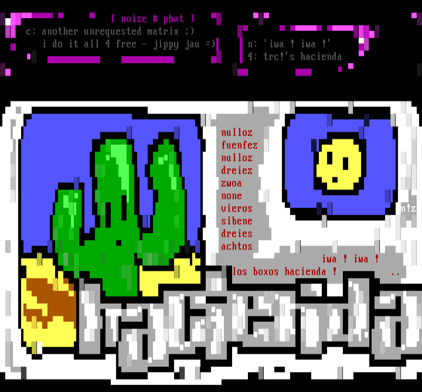 nulloz fuenfez nulloz dreiez zwoa none vieros n!z sibene dreies achtos iwa ! iwa ! los boxos hacienda ! ..