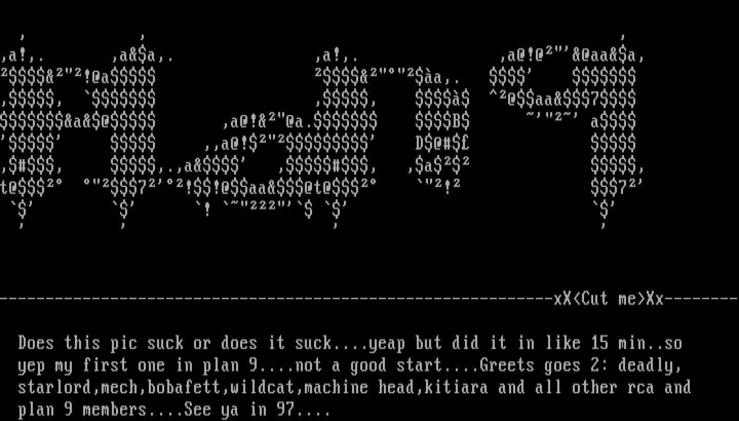 yep my first one in plan 9....not a good start....Greets goes 2: deadly,