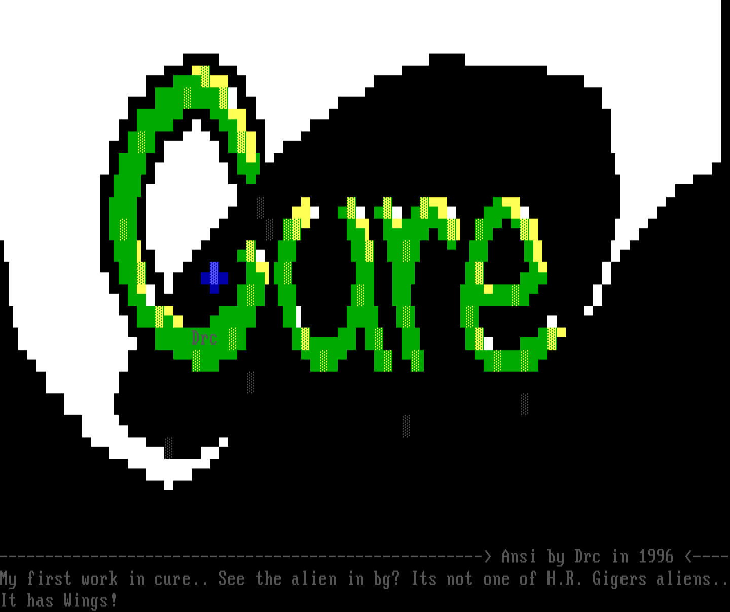 ----------------------------------------------------- Ansi by Drc in 1996 ----My first work in cure.. See the alien in bg? Its not one of H.R. Gigers aliens..It has Wings!