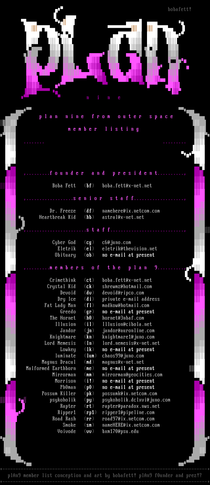 +------------------------------------------------------------------------------+ plAn9 member list conception and art by bobafett! plAn9 f0under and prez!?