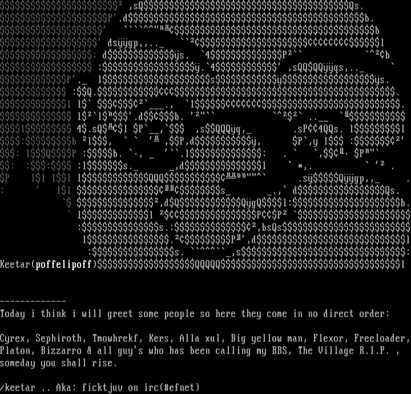 Cyrex, Sephiroth, Tmowhrekf, Kers, Alla xul, Big yellow man, Flexor, Freeloader,Platon, Bizzarro all guys who has been calling my BBS, The Village R.I.P. ,