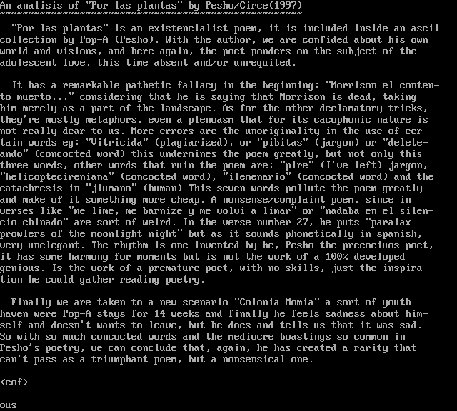 Por las plantas is an existencialist poem, it is included inside an ascii