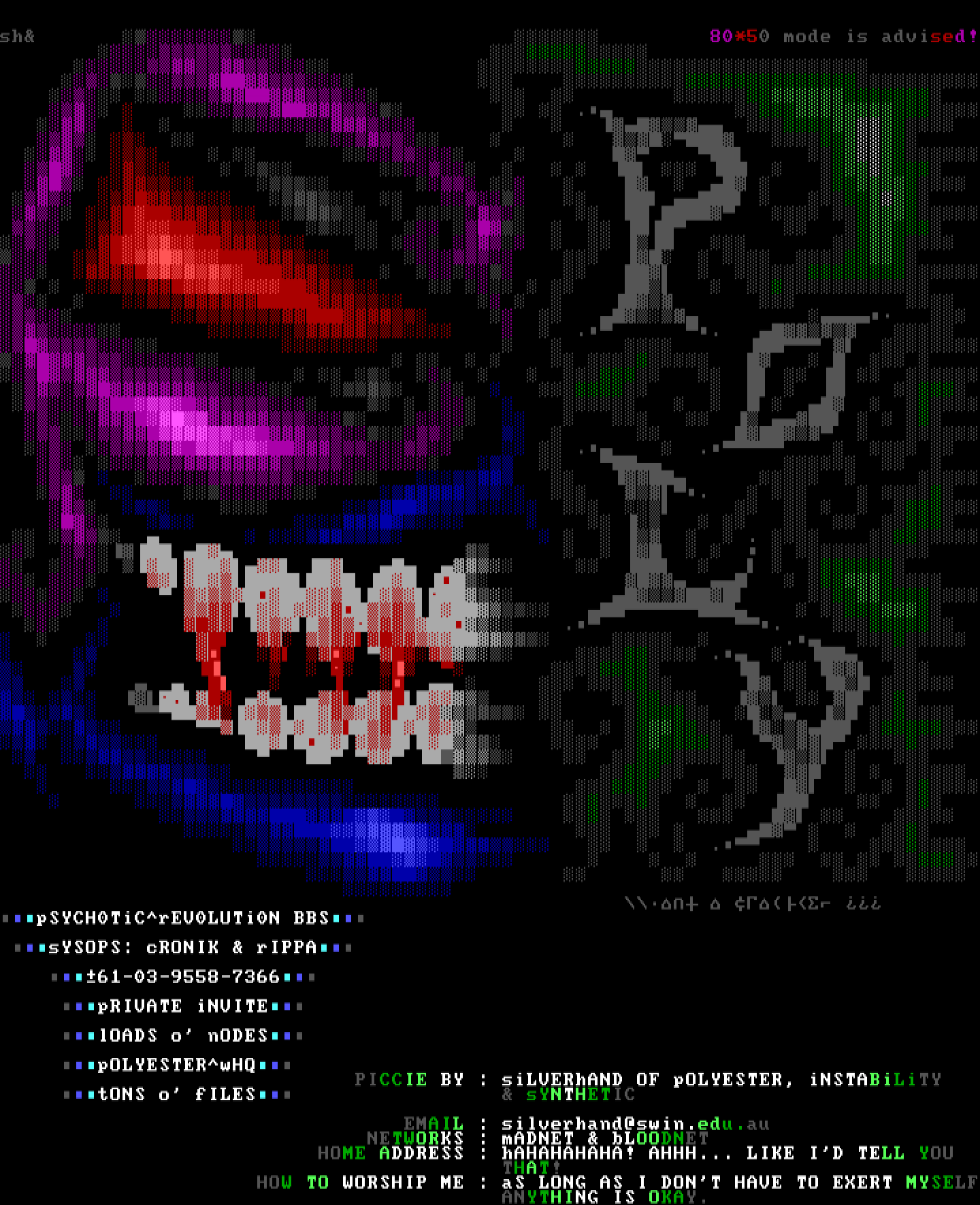 sh 80*50 mode is advised! . . . . . . . . . . . . . pSYCH0TiCrEV0LUTi0N BBS sYSOPS: cRONIK rIPPA 61-03-9558-7366 pRIVATE iNVITE lOADS o nODES pOLYESTERwHQ PICCIE BY : siLVERhAND OF pOLYESTER, iNSTABiLiTY tONS o fILES sYNTHETIC EMAIL : silverhand@swin.edu.au NETWORKS : mADNET bLOODNET HOME ADDRESS : hAHAHAHAHA! AHHH... LIKE ID TELL YOU THAT! HOW TO WORSHIP ME : aS LONG AS I DONT HAVE TO EXERT MYSELF ANYTHING IS OKAY.