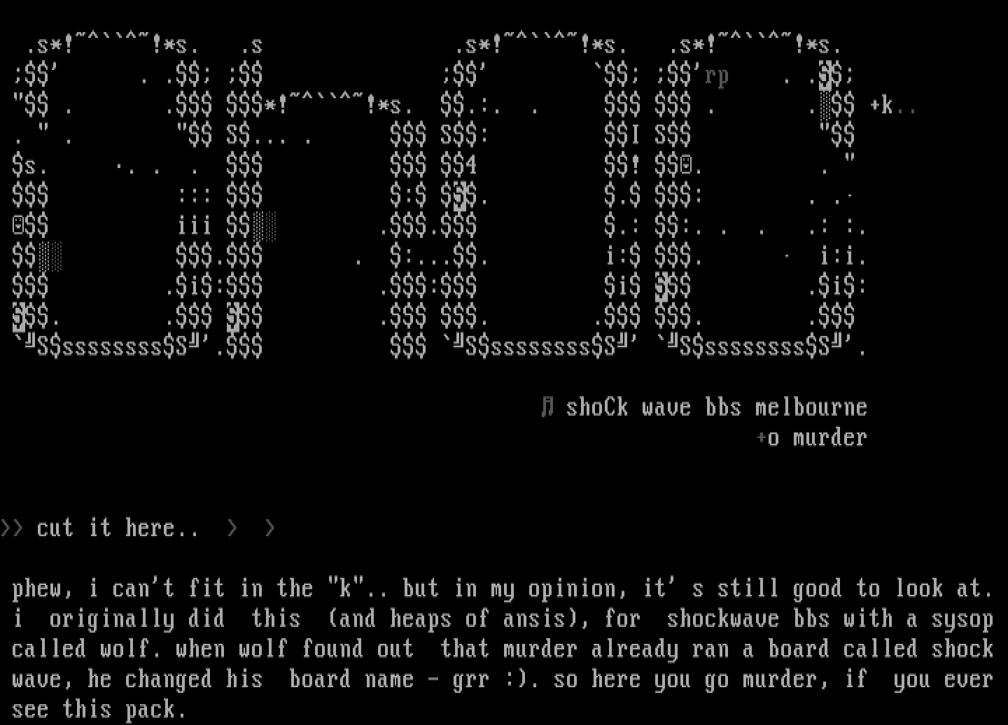 i originally did this and heaps of ansis, for shockwave bbs with a sysop