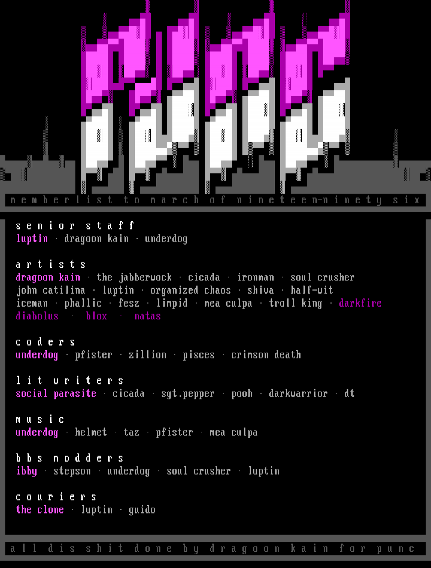m e m b e r l i s t t o m a r c h o f n i n e t e e n-n i n e t y s i x s e n i o r s t a f f luptin dragoon kain underdog a r t i s t s dragoon kain the jabberwock cicada ironman soul crusher john catilina luptin organized chaos shiva half-wit iceman phallic fesz limpid mea culpa troll king darkfire diabolus blox natas c o d e r s underdog pfister zillion pisces crimson death l i t w r i t e r s social parasite cicada sgt.pepper pooh darkwarrior dt m u s i c underdog helmet taz pfister mea culpa b b s m o d d e r s ibby stepson underdog soul crusher luptin c o u r i e r s the clone luptin guido a l l d i s s h i t d o n e b y d r a g o o n k a i n f o r p u n c