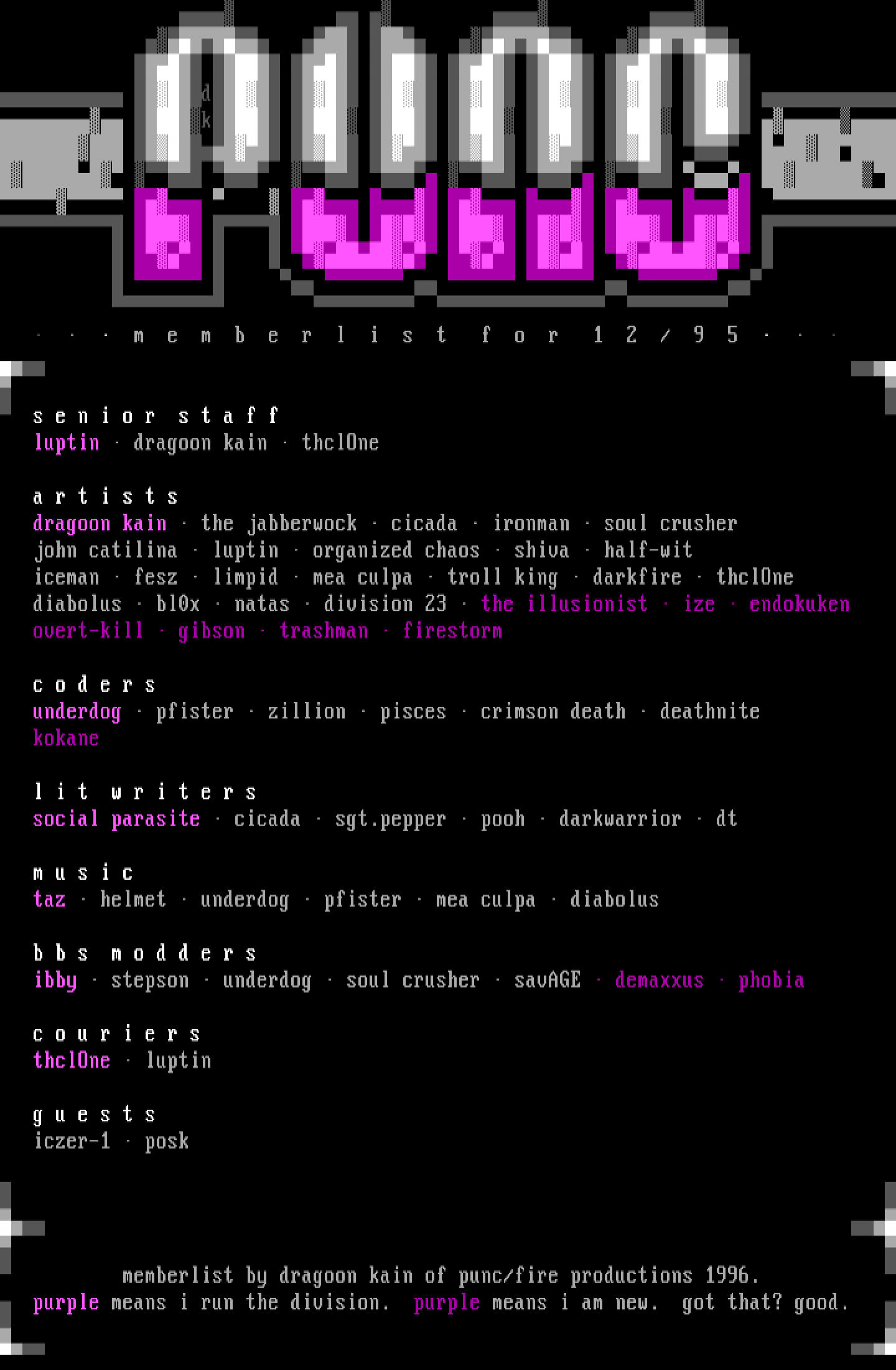 memberlist by dragoon kain of punc/fire productions 1996. purple means i run the division. purple means i am new. got that? good.
