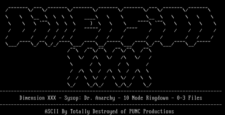 Dimension XXX - Sysop: Dr. Anarchy - 10 Node Ringdown - 0-3 Files