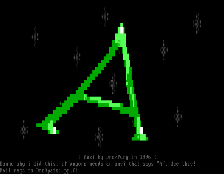 ---------------------------- Ansi by Drc/Purg in 1996 ------------------------Dunno why i did this. if anyone needs an ansi that says A. Use this!