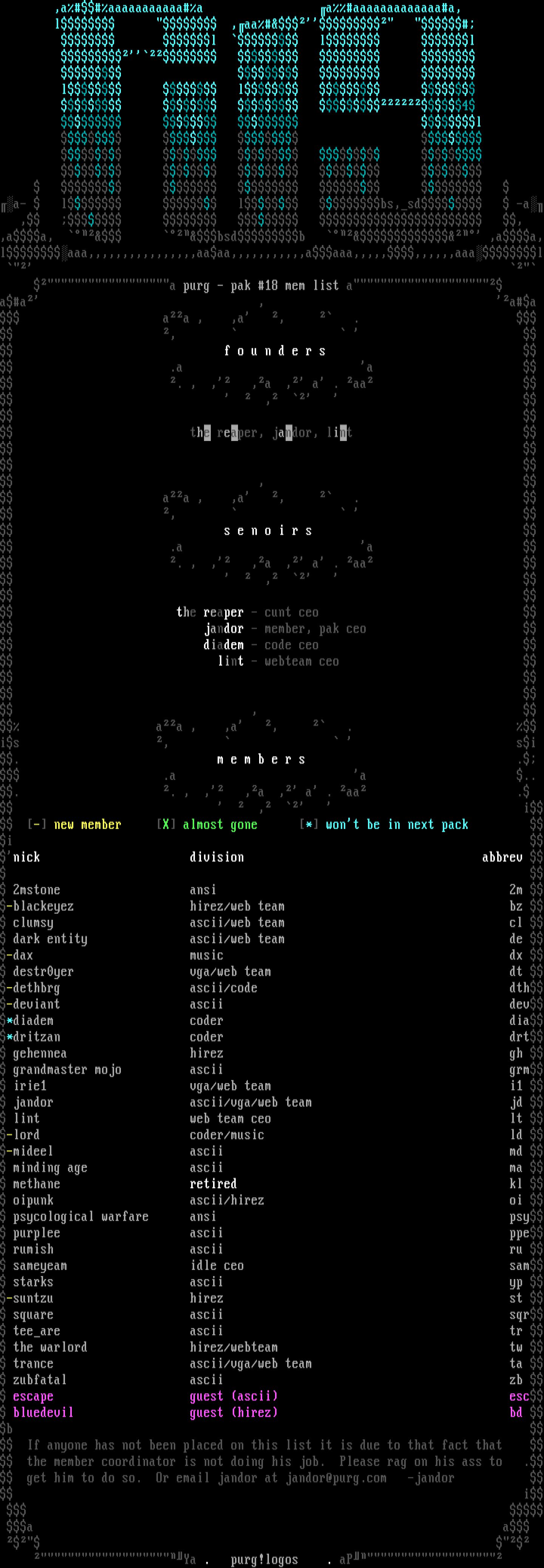 , i - new member X almost gone * wont be in next pack i nick division abbrev 2mstone ansi 2m -blackeyez hirez/web team bz clumsy ascii/web team cl dark entity ascii/web team de -dax music dx destr0yer vga/web team dt -dethbrg ascii/code dth-deviant ascii dev*diadem coder dia*dritzan coder drt gehennea hirez gh grandmaster mojo ascii grm irie1 vga/web team i1 jandor ascii/vga/web team jd lint web team ceo lt -lord coder/music ld -mideel ascii md minding age ascii ma methane retired kl oipunk ascii/hirez oi psycological warfare ansi psy purplee ascii ppe rumish ascii ru sameyeam idle ceo sam starks ascii yp -suntzu hirez st square ascii sqr teeare ascii tr the warlord hirez/webteam tw trance ascii/vga/web team ta zubfatal ascii zb escape guest ascii esc bluedevil guest hirez bd b If anyone has not been placed on this list it is due to that fact that the member coordinator is not doing his job. Please rag on his ass to . get him to do so. Or email jandor at jandor@purg.com -jandor i a a