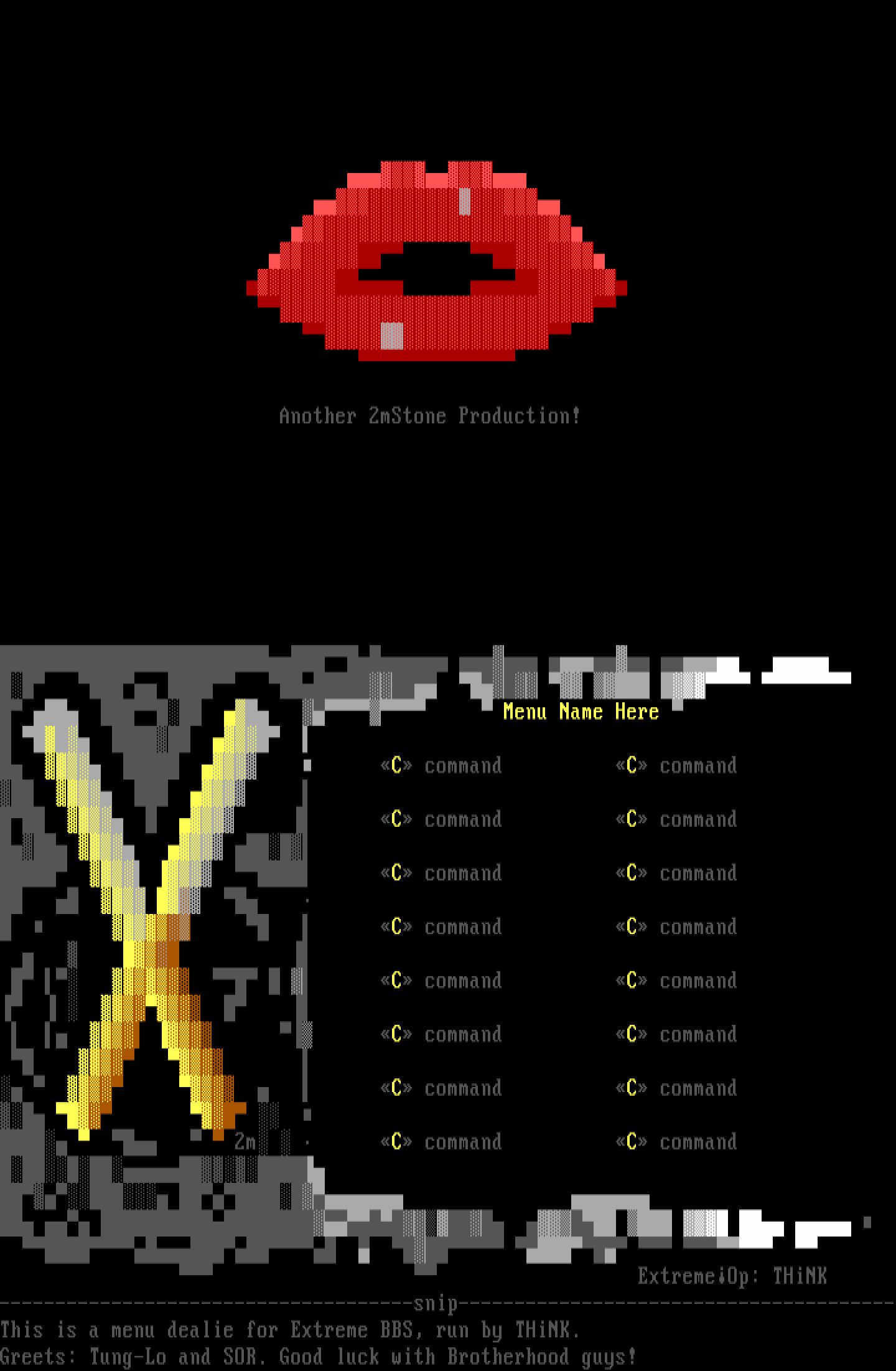 -------------------------------------snip---------------------------------------This is a menu dealie for Extreme BBS, run by THiNK.