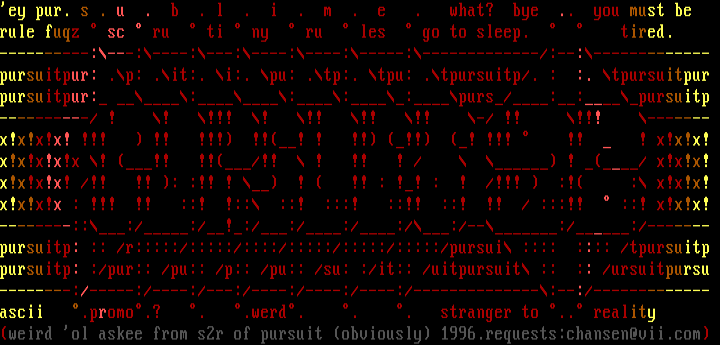 ----------:---:----:---:----:----:-----:-------------/:--:------------- pursuitpur: .p: .it:. i:. pu: .tp:. tpu: .tpursuitp/. : :. tpursuitpur pursuitpur: ::::purs/::pursuitp ----------/ ! ! !!! ! !! !! !! -/ !! !!! ------- x!x!x!x! !!! !! !!! !!! ! !! !! ! !!! !! ! x!x!x! x!x!x!x!x ! !! !!/!! ! !! ! / ! / x!x!x! x!x!x!x! /!! !! : :!! ! ! !! : !! : ! /!!! :! : x!x!x! x!x!x!x : !!! !! ::! !:: ::! :::! ::!! ::! !! / :::!! ::! x!x!x! --------:::/:/!:/:/:/:/:/--:/:/------- pursuitp: :: /r:::::/:::::/::::/:::::/:::::/:::::/pursui :::: :::: /tpursuitp pursuitp: :/pur:: /pu:: /p:: /pu:: /su: :/it:: /uitpursuit :: :: /ursuitpursu --------:/-----:/----:/---:/----:/----:/----:/--------------:--:/------------- ascii .promo.? . .werd. . . stranger to .. reality