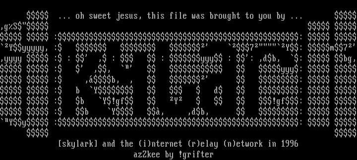 ... oh sweet jesus, this file was brought to you by ... ,gS :: Yyyyyy, : 7Y: m7,yyyy : : , : : yyy : : ,db, : bg, : ,, yyy: : ,b, , : : b Y d : : b Y!gf Y !gf: : b Y , ,db, : Yy :: skylark and the internet relay network in 1996