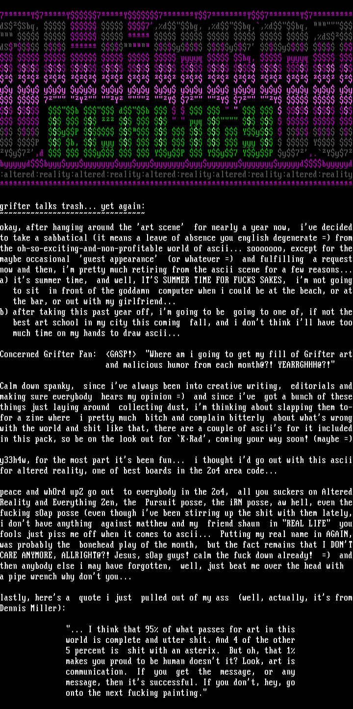 y33h4w, for the most part its been fun... i thought id go out with this asciifor altered reality, one of best boards in the 2o4 area code...