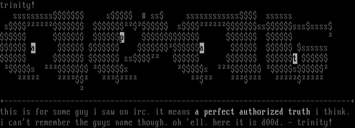 +------------------------------------------------------------------------------+this is for some guy i saw on irc. it means a perfect authorized truth i think.