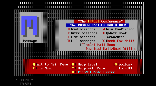 Vi s ii os nn sA E n t e r p r is s en so R ANDBBS!AmateurRadio tneserP g sepBm ena O nia d k S e sIe D d tt va / R H s iil C L ot h de Mf e fa cnB e SUW e nD-Mefc d b g e XU L e D N aF V eTs t FiS t sl Qe e lnm LM o R G e r O n aalooao O te s rms Mpf u cat .oBR Rh r -C nu i eo K o/ do s lfgoHe m ee nEl p e sr i C ! LoT e Ah n n M?f a Ms t ew eT A i i aA al i e i oagRe l n a we n s a F e ee h sTl Ao iue e H isaR e f 0d R n rM m eo lMEdM m t e s s diKc u / Coseo !Nn g EJ C e l yg The RAVE Conference The KB0DSW AMATEUR RADIO BBS! Read messages Join Conference Enter messages Update Conf. List messages Scan/Read Message Kill messages Check For Mail! TomCat-Mail Room Download Mail/Read Offline Quit to Main Menu H Help Level Goodbye/ File Menu ? Help with Menu Log-Off X FidoNet Node Lister - RACER -RAVE