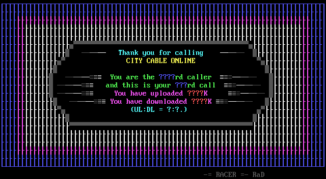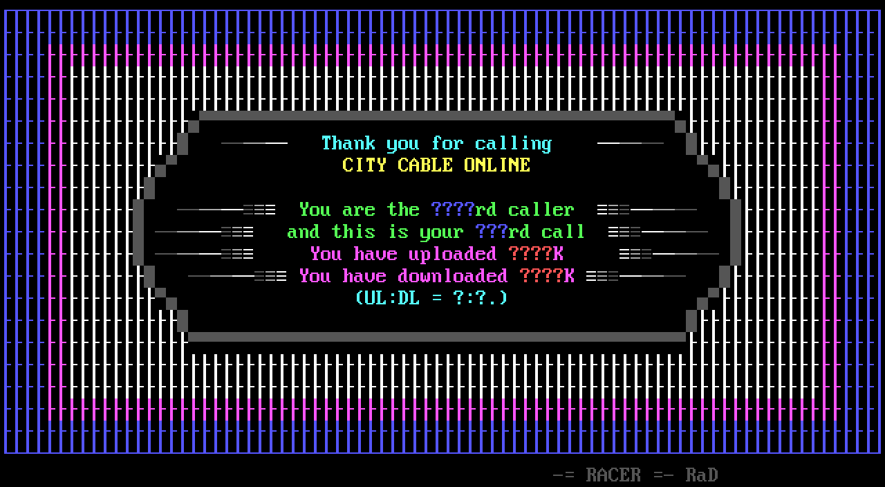 Thank you for calling CITY CABLE ONLINE You are the ????rd caller and this is your ???rd call You have uploaded ????K You have downloaded ????K UL:DL ?:?. - RACER - RaD