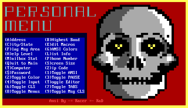 Address BHighest Baud City/State Edit Macros . . Flag Msg Area GANSI Colors Help Level List Info Mailbox Stat Phone Number Quit to Main Screen Size TComputer Zip Code Password 1Toggle ANSI 2Toggle Color 3Toggle PAUSE 4Toggle Input Toggle Editor 6Toggle CLS 7Toggle TABS 8Toggle Menus 9Toggle Msg CLS Ansi By - Racer - RaD