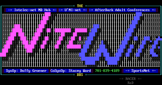 THE - Intelec-net ND Hub -- UNI-net -- AfterDark Adult Conferences - SysOp: Duffy Groener CoSysOp: Stacey Ward 701-839-4189 - SportsNet - BBS - RACER -