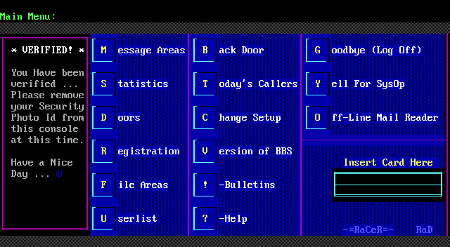 * VERIFIED! * M essageAreas B ackDoor G oodbyeLog Off You Have been verified ... S tatistics T odaysCallers Y ellForSysOp Please remove your Security Photo Id from D oors C hangeSetup O ff-LineMailReader this console at this time. R egistration V ersionofBBS Have a Nice Insert Card Here Day ... F ileAreas ! -Bulletins U serlist ? -Help-RaCeR-RaD