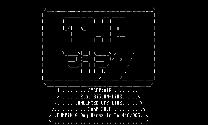 ....2.o..GiG.ON-LiNE...... /........UNLiMTED.OFF-LiNE....... /.............ZooM 28.8............ /..PUMPiN 0 Day Warez In Da 416/905.. ..................................../