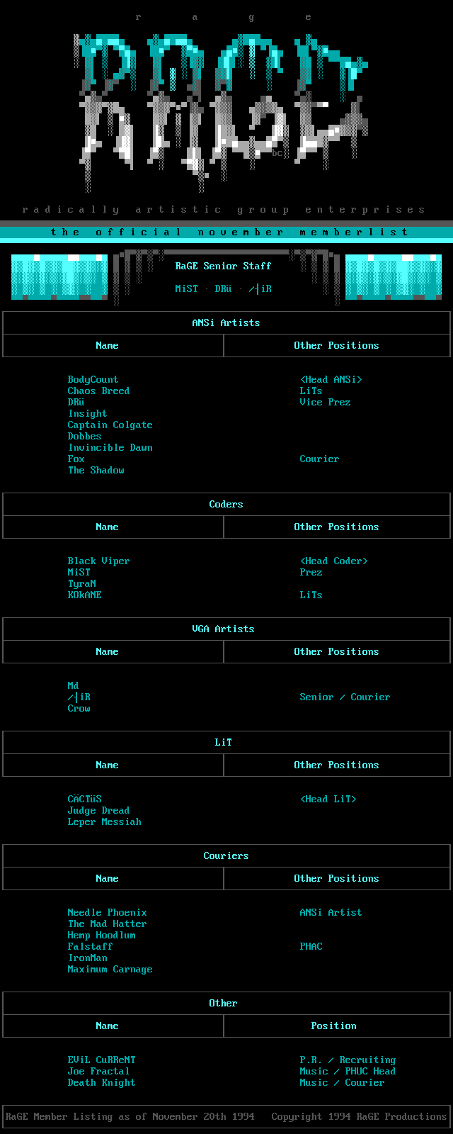 RaGE Member Listing as of November 20th 1994 Copyright 1994