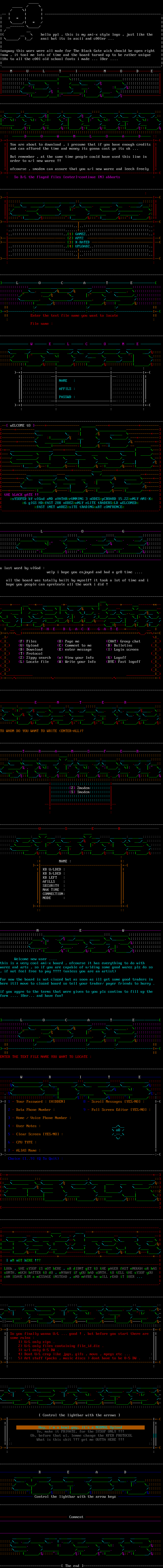 .-- ---------------------------------------------------------. * / * / ------- / / hello ppl , this is my ami-x style logo , just like the / / ansi but its in ascii and c00ler ... anyway this worx were all made for The Black Gate wich should be open right now , it tool me lots of time and the board turned up to be rather unique 10x to all the c00l old school fonts i made ... l8er .... ------------------------------------------------------------------------------MULTINODE