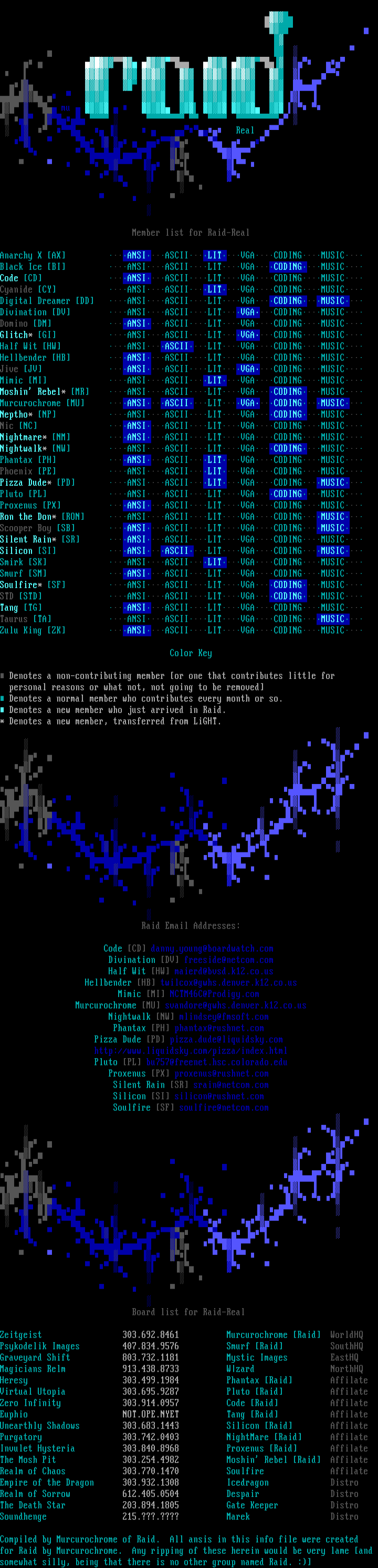 Compiled by Murcurochrome of Raid. All ansis in this info file were created for Raid by Murcurochrome. Any ripping of these herein would be very lame and somewhat silly, being that there is no other group named Raid. :