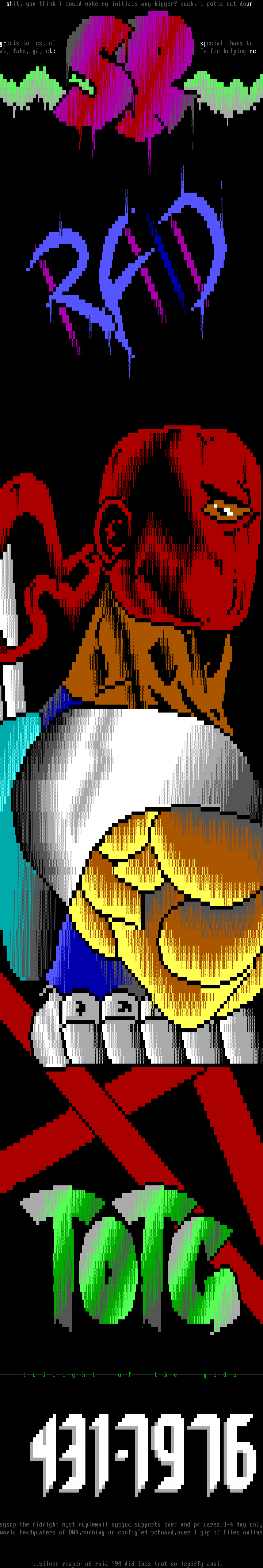 sysop:the midnight myst.nup:email sysgod.supports snes and pc warez.O-4 day onlyworld headquaters of DWA.running on configed pcboard.over 1 gig of files online